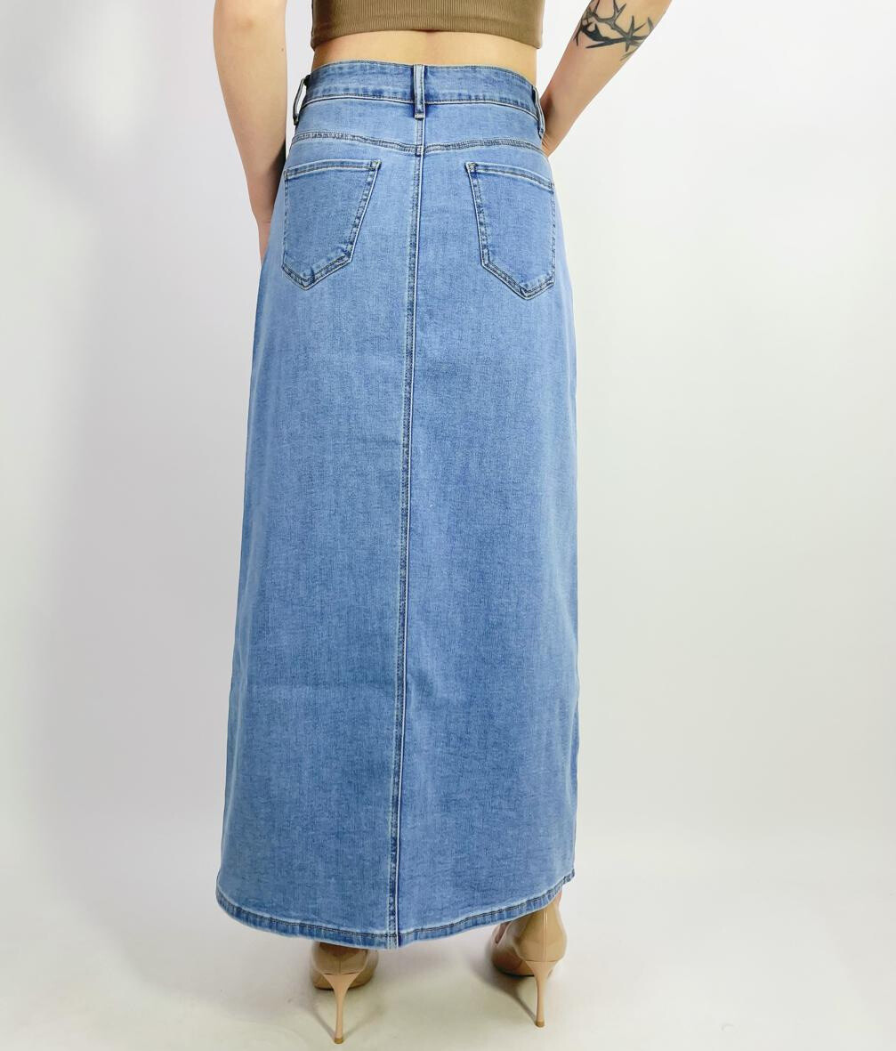 • Jupe en denim stretch confortable • Coupe longue droite avec fente élégante à l'avant • Taille haute qui sublime la silhouette • Poches avant et arrière • Fermeture zippée et bouton à la taille