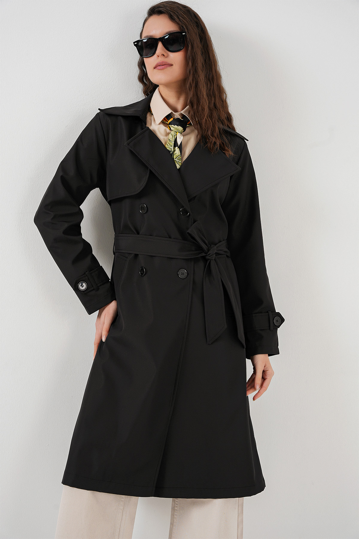 • Trench long à double boutonnage avec ceinture à nouer à la taille • Col large et revers classiques pour une allure élégante • Poches latérales pratiques • Détails de boucles aux poignets • Coupe structurée qui flatte toutes les silhouettes